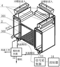 2.根据权利要求1所述的磁力吸附的腔式太阳能颗粒吸热器,其特征是:还包括颗粒换热器、分别安装在腔体框架内的上、下两个侧面的2个吸热管板、信号采集器和控制器;所述的2个吸热管板之间连通并内部通有换热工质;所述的3个颗粒输运装置的颗粒收集器中的高温颗粒均流到颗粒换热器内,吸热管板的换热工质流入颗粒换热器内进行二次加热后流出;所述的信号采集器采集3个颗粒输运装置中刚下落到颗粒收集器的颗粒的温度,并反馈给控制器用于控制各颗粒输运装置中的输送机、流量控制阀和颗粒厚度控制器的工作。