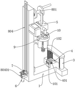 驱动机构(8),所述驱动机构(8)由收卷轮(801)、第一转动轴(802)、第二转动轴(803)、升降框架(804)和安装块(80401)共同组成,收卷轮(801)的外侧安装有一个锥齿轮盘,在收卷轮(801)转动时会带动锥齿轮盘转动,通过收卷轮(801)对软管进行收卷,收卷轮(801)安装在支撑架(1)的外侧,第一转动轴(802)的两端均安装有一个第一锥齿轮,上端的第一锥齿轮与锥齿轮盘相啮合,因此在收卷轮(801)转动时会带动第一转动轴(802)转动,第二转动轴(803)的端部安装有一个第二锥齿轮,第二锥齿轮和第一锥齿轮相啮合,因此在第一转动轴(802)转动时会带动第二转动轴(803)转动,第二转动轴(803)的外侧安装有一个拨动齿轮,在第二转动轴(803)转动时会带动拨动齿轮转动,升降框架(804)的外侧有一个齿条,齿条与拨动齿轮相啮合,在拨动齿轮转动时会推动升降框架(804)上下滑动,安装套筒(6)开设有一个环形槽,安装块(80401)卡接在安装套筒(6)的环形槽内,因此安装块(80401)对安装套筒(6)进行位置锁定,安装块(80401)的内侧有一个安装槽,安装块(80401)的外侧有一个倾斜面,倾斜面方便安装套筒(6)的安装,在升降框架(804)移动时会带动安装块(80401)移动,从而使安装块(80401)带动安装套筒(6)移动,从而使安装套筒(6)进行位置调节;
