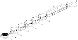 步骤2,将碳毡原料卷(15)的首端牵出,并依次穿过处理设备的若干个处理池、清洗池、分级热处理系统(9),且位于处理池内的碳毡料(14)始终没入处理液中,并将碳毡料(14)卷的首端连接在处理设备的收卷机构(10)上;